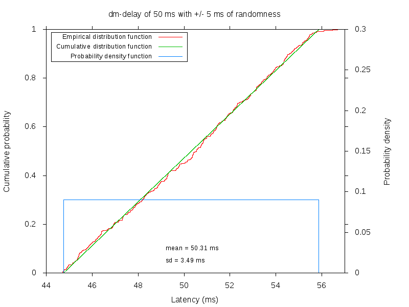 This computed average of the distribution is 50.31 ms, which correspond with a good approximation to the delay parameter of the target, 50 ms. The observed minimum and maximum parameters of the uniform distribution are respectively 44.75 ms and 55.87 ms, which are close to the theoretical values of 45 ms and 55 ms, more or less the statistical errors.
