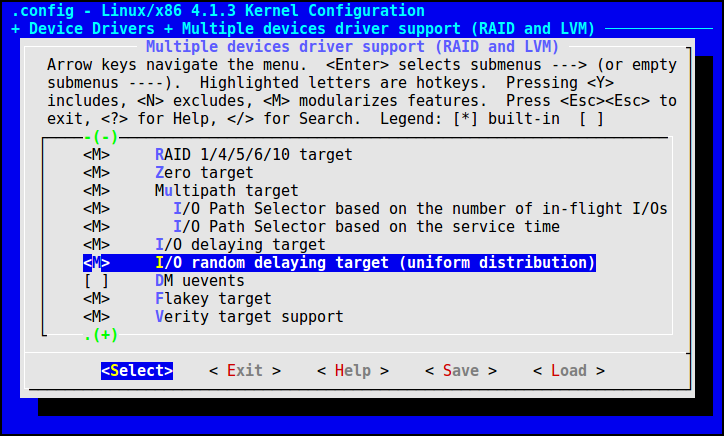 Go to Device Drivers, Multiple devices driver support (RAID and LVM) and select I/O random delaying target (uniform distribution):